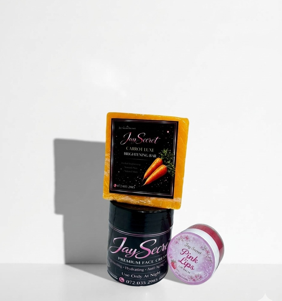 Includes a brightening face cream to fade dark spots and hydrate, a carrot glow soap to cleanse and reduce blemishes, and a pink lip balm to moisturize and soften lips.